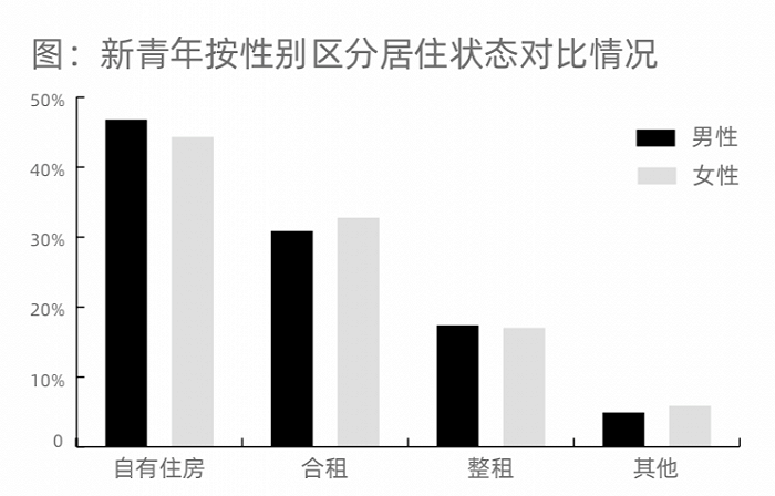 报告显示,租房仍是新青年的主流,约49.2%的受访者目前正租房居住,约45.3%受访者的居住状态是自有住房。无论男性还是女性,合租均是主流的租赁方式,但男性受访者自有住房的占比相对更高。