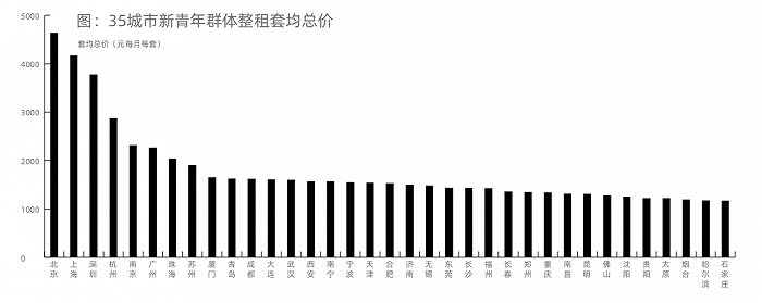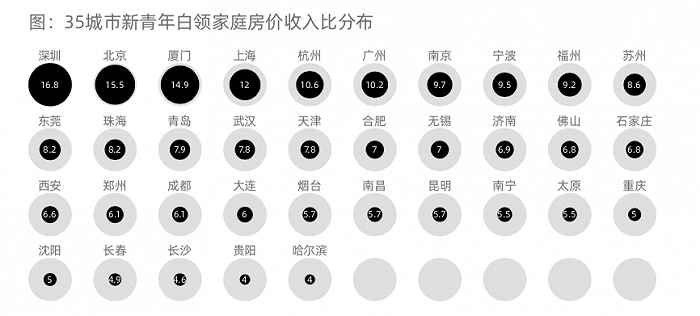 类似房价收入比,贝壳研究院还按月度租金与白领月薪测算出“房租收入比”。结果显示,北京、上海及深圳的新青年群体房租收入比达到30以上,也就是说,新青年白领30%以上的月薪用来支付房租。