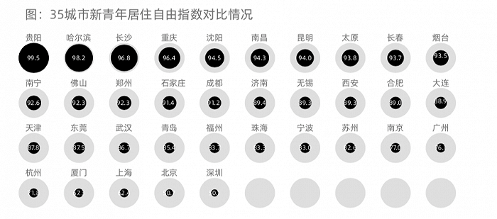 如果综合考虑“房价收入比”及“房租收入比”,新青年居住自由指数排名前五的城市为贵阳、哈尔滨、长沙、重庆及沈阳,这些城市居住负担相对较低。一线城市化居住自由指数约59.8,远低于新一线城市的88.0。