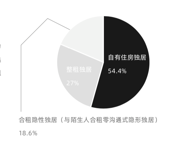 报告显示,在新青年受访群体中,独居的百分占比高达63.6%。从居住方式看,选择自由住房独居的约54.4%,其次是整租独居,百分占比约27%,还有18.6%的受访者因与陌生人合租零沟通,隐形独居。