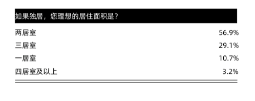 从购房选择看,两居室是独居群体的理想居住户型。39.3%的受访者表示理想的独居住房面积是60-90平,34.4%的受访者认为理想的独居住房面积为90-120平;从户型看,理想的独居住房是两居室,占比达56.9%。