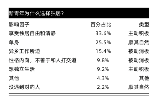 独居青年人数不断上升,既有被动因素,但更多是青年主动选择的结果。其中,享受自由和清静是他们选择独居最重要的原因,此外还有单身导致的独居,以及因为异地工作导致的“被动消极型”独居。
