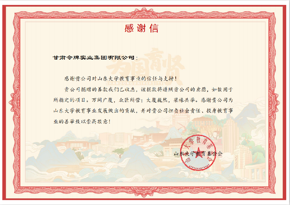 饮水思源,携手同行。山东大学“山东大学新百廿基金”由山东大学、山东大学校友会、教育基金会共同发起,该筹款活动以线上众筹和线下捐赠相结合的形式,筹措、建立起支持山东大学永续发展的公益资金池。令牌集团的多位创始成员均为山大校友,在发展自身,争创一流的同时,心系母校,不忘教育,凝心聚力,大力支持“山东大学新百廿基金”活动,帮助更多山大学子追逐梦想,以此来纪念山大多年的谆谆教诲与悉心爱护。